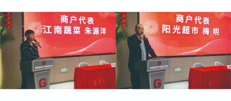商戶代表江南蔬菜總經(jīng)理朱源洋、陽(yáng)光超市董事長(zhǎng)梅明發(fā)表了講話。